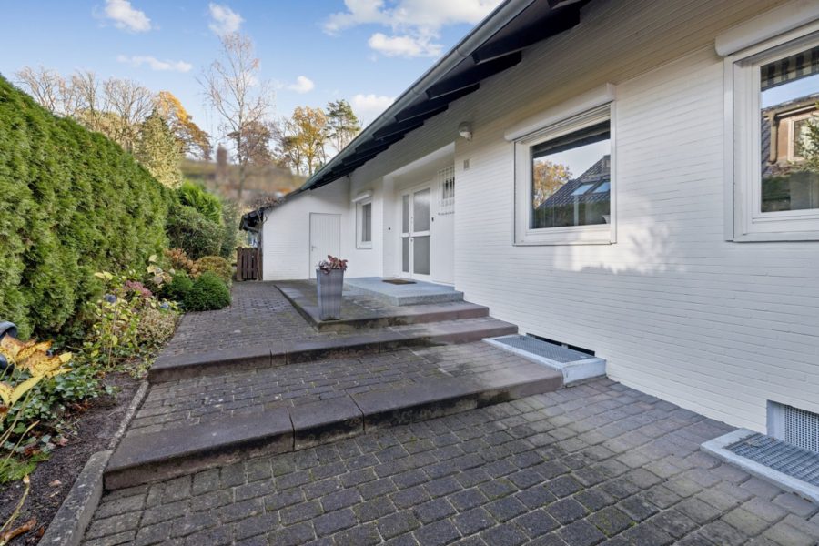 Eine komfortable, gepflasterte Einfahrt führt zum Eingangsbereich.