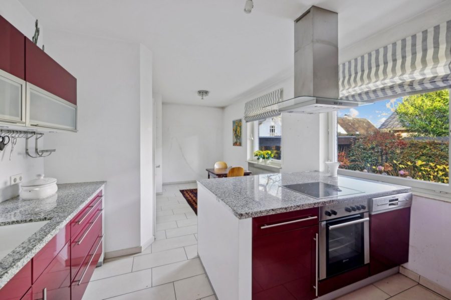 Die Küche liegt, zusammen mit der Garderobe und dem Gäste-WC, separat. Die Einbauküche mit allen Elektrogeräten ist modern und voll funktionsfähig.. Im hinteren Teil liegt der Zugang zu den Kellerräumen.