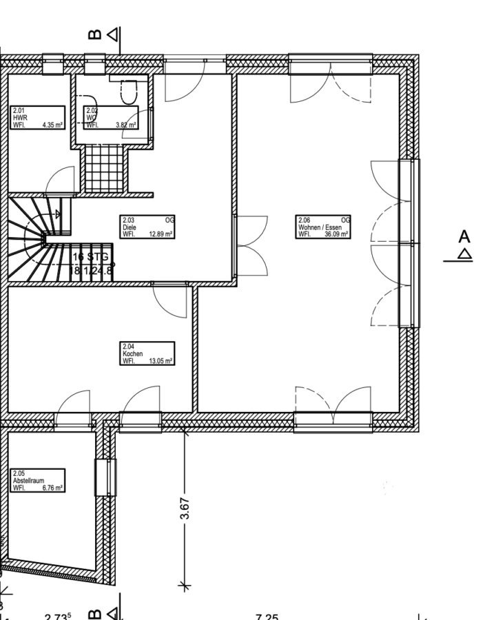 Der durchdachte Eingangsbereich mit ausreichend Platz für eine Garderobe, einem Gäste-WC mit Dusche und einem Hauswirtschaftsraum, eröffnet den Zutritt zu sämtlichen Räumen des Erdgeschosses.
