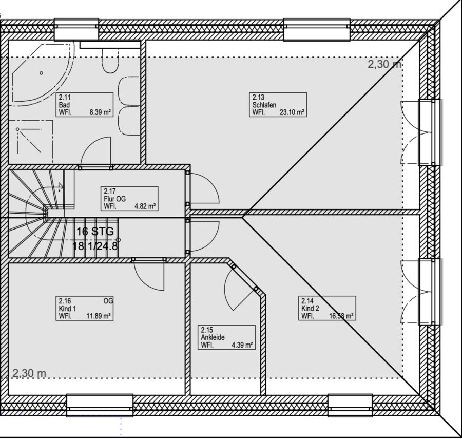 Im 1. Obergeschoss befinden sich drei Schlafzimmer, eins davon mit Ankleide, sowie ein Vollbad mit Dusche und Badewanne.