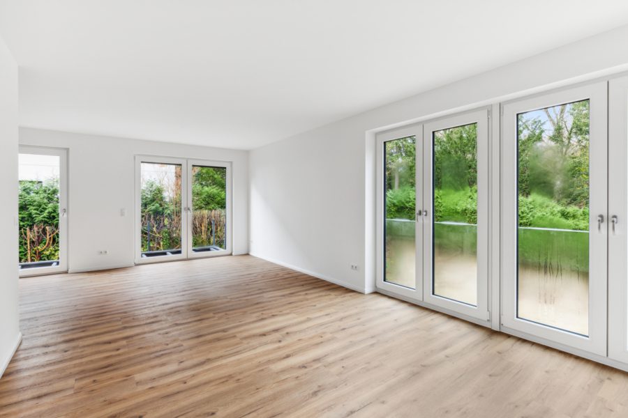 Mit einem gemütlichen Wohn- und Essbereich und einer offenen Wohnküche besticht die Wohnung durch ihren ganz eigenen Charme. Das Badezimmer der Neubauwohnung ist mit modernen Fliesen in Betonoptik, einer bodengleichen Regendusche und hochwertigen Armaturen ausgestattet. In den Wohnräumen sowie der offenen Wohnküche wird ein hochwertiger Vinylfußboden verlegt. Teilweise bodentiefe Glasfronten sorgen für ein lichtdurchflutetes Raumgefühl.