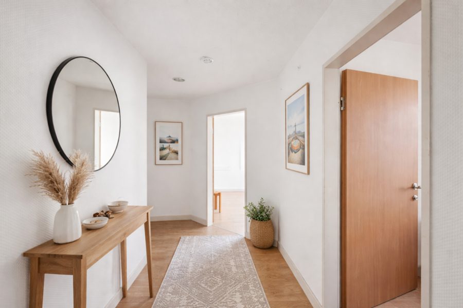 Durch den großen Eingangsbereich, der genug Platz für eine Garderobe oder einen Einbauschrank bietet, geht es durch den Flur in die Küche, das Schlafzimmer, das Bad und den großzügigen Wohn- und Essbereich mit Zugang auf den geschützten Balkon mit Südwestausrichtung.